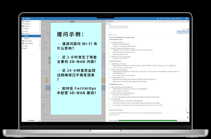 - 上下文感知响应:FortiAI 可基于实时网络遥测数据和历史趋势,快速回复相关问题。